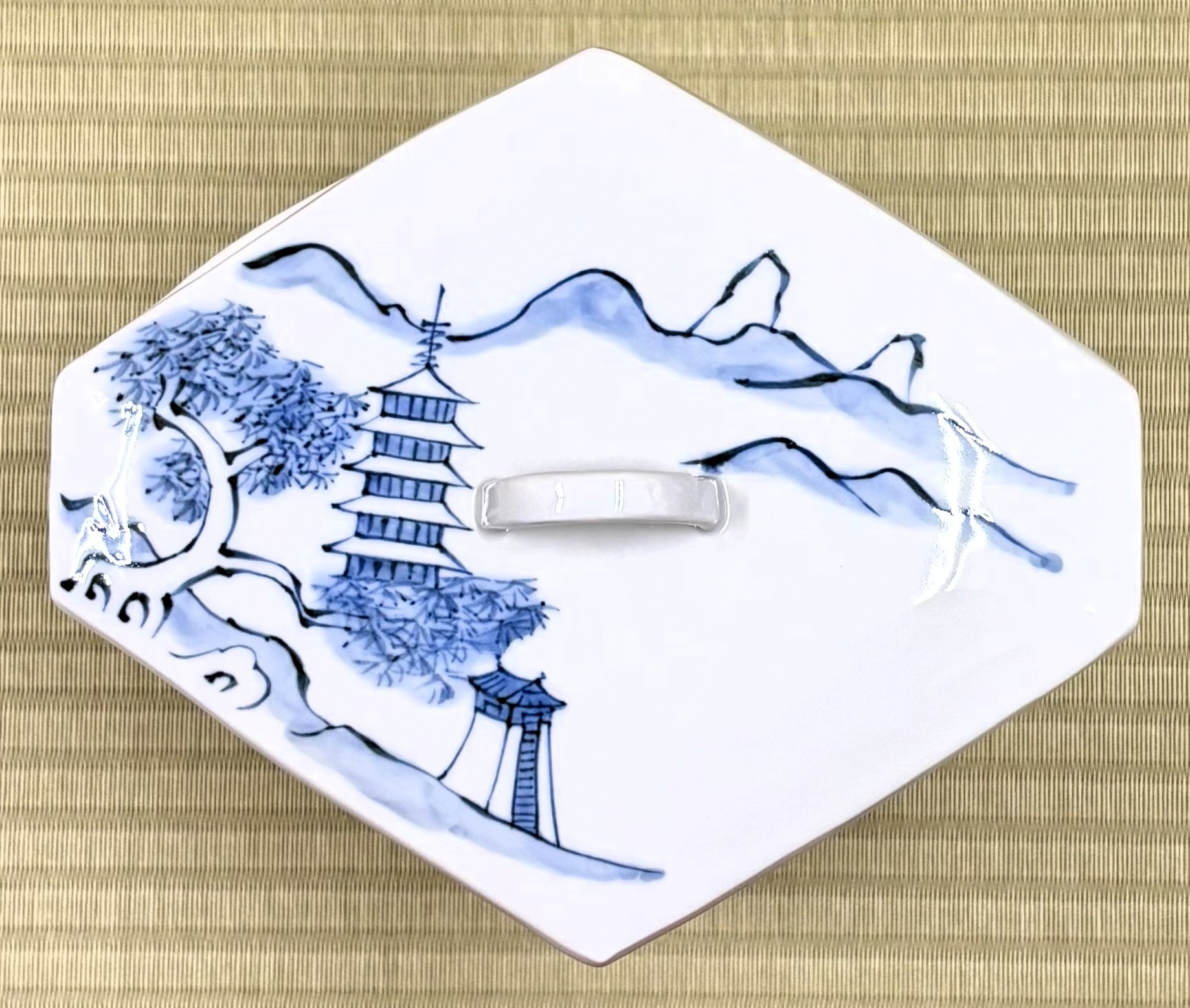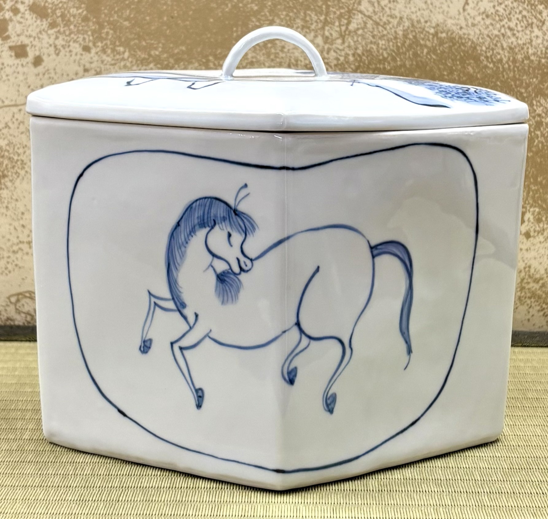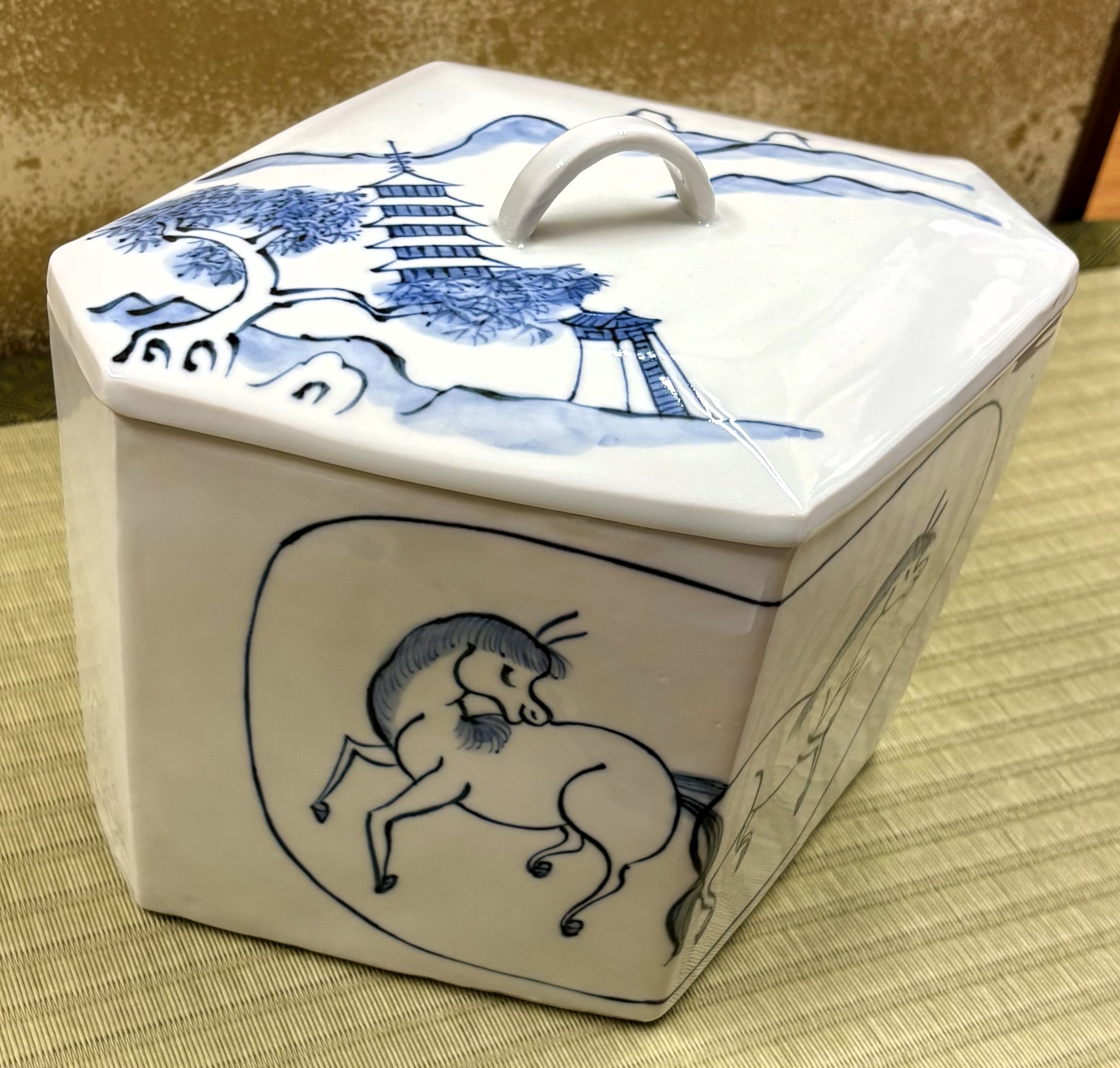 これは、日本人が中国に依頼して作ってもらったのが始まりと言われています。大きな団扇型の中に表には2頭の馬、裏には1頭の馬が描かれています。蓋は共蓋でできており、山水図の模様が描かれていて、摘まみは竹節の形をしています。