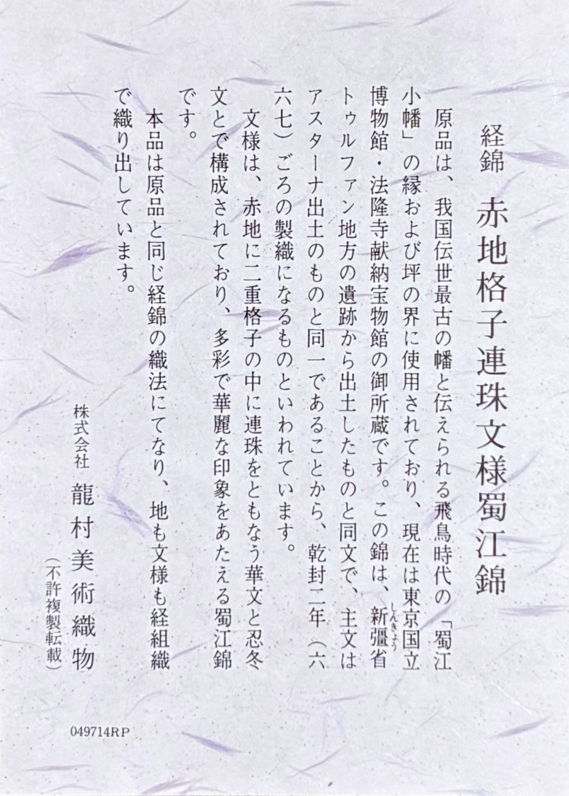 「龍村美術織物」とは、1894年(明治27年)に京都・西陣の地で、初代龍村平藏(1876年~1962年)によって創業された、美術織物制作を専門とする老舗メーカーです。初代平藏は、織りの技法に創意工夫を重ね、新たな織物の美の追求と古代の織物の研究・復元に尽力し、日本だけでなく海外にもその名が知られています。