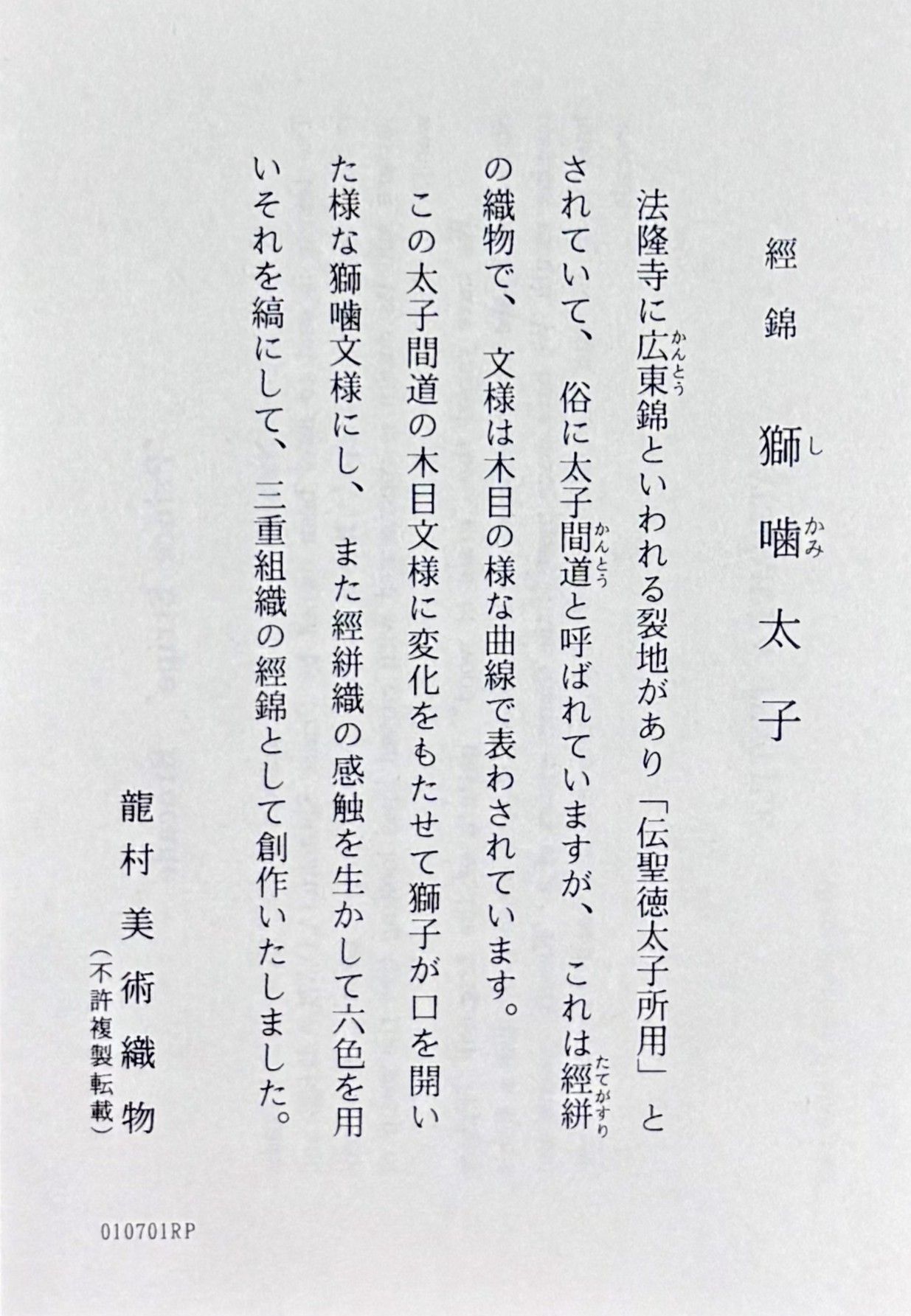 「龍村美術織物」とは、1894年(明治27年)に京都・西陣の地で、初代龍村平藏(1876年~1962年)によって創業された、美術織物制作を専門とする老舗メーカーです。初代平藏は、織りの技法に創意工夫を重ね、新たな織物の美の追求と古代の織物の研究・復元に尽力し、日本だけでなく海外にもその名が知られています。