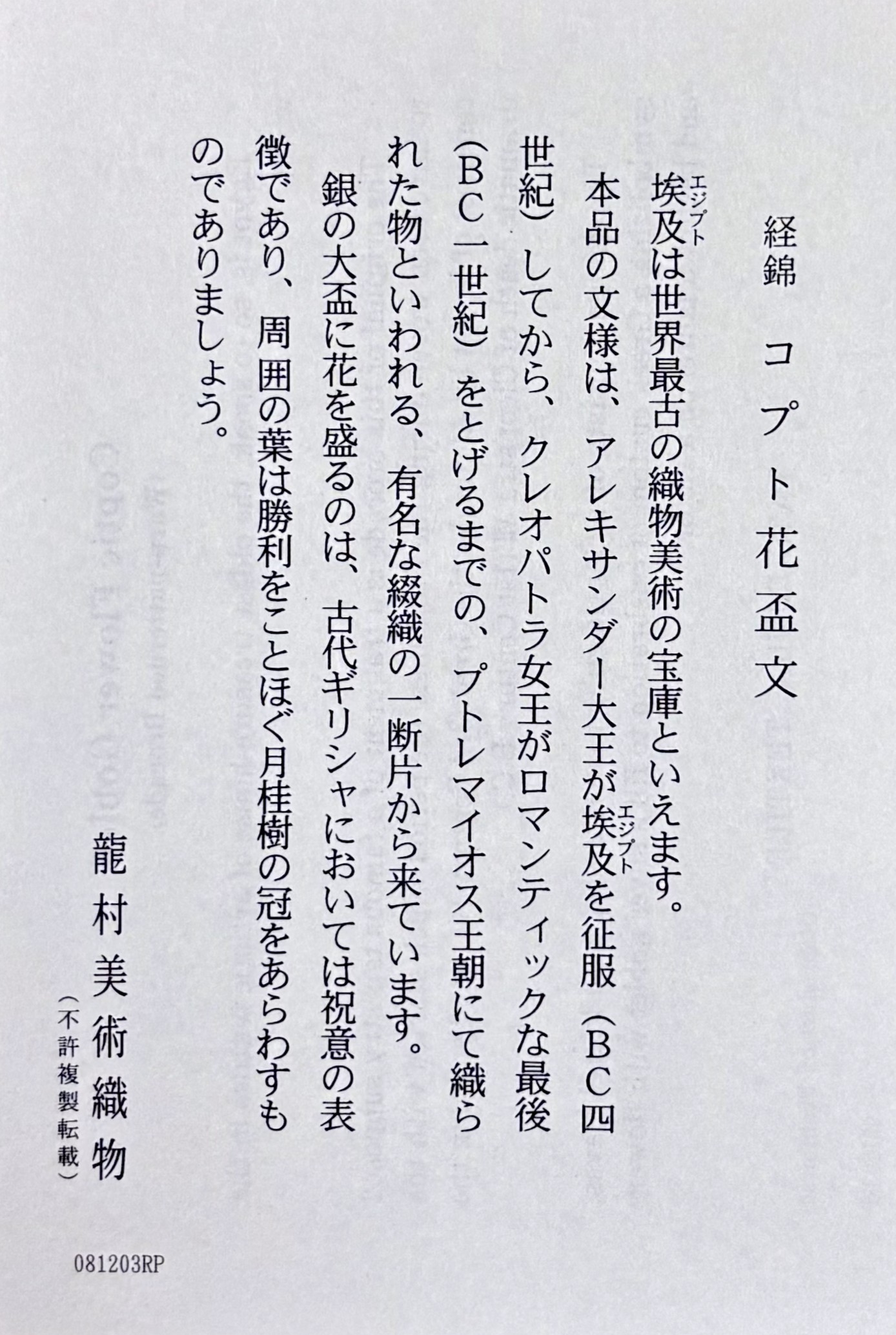 「龍村美術織物」とは、1894年(明治27年)に京都・西陣の地で、初代龍村平藏(1876年~1962年)によって創業された、美術織物制作を専門とする老舗メーカーです。初代平藏は、織りの技法に創意工夫を重ね、新たな織物の美の追求と古代の織物の研究・復元に尽力し、日本だけでなく海外にもその名が知られています。