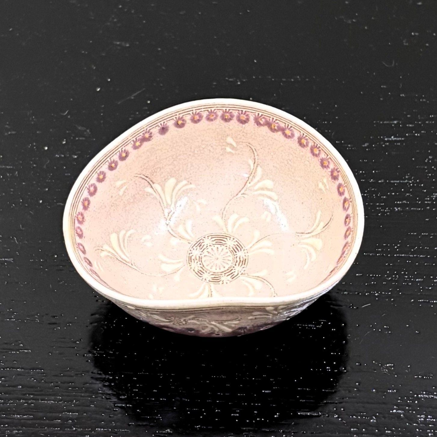 細やかに花文様を押印し、白土を埋め込む印花という伝統的な技法の三島手を、