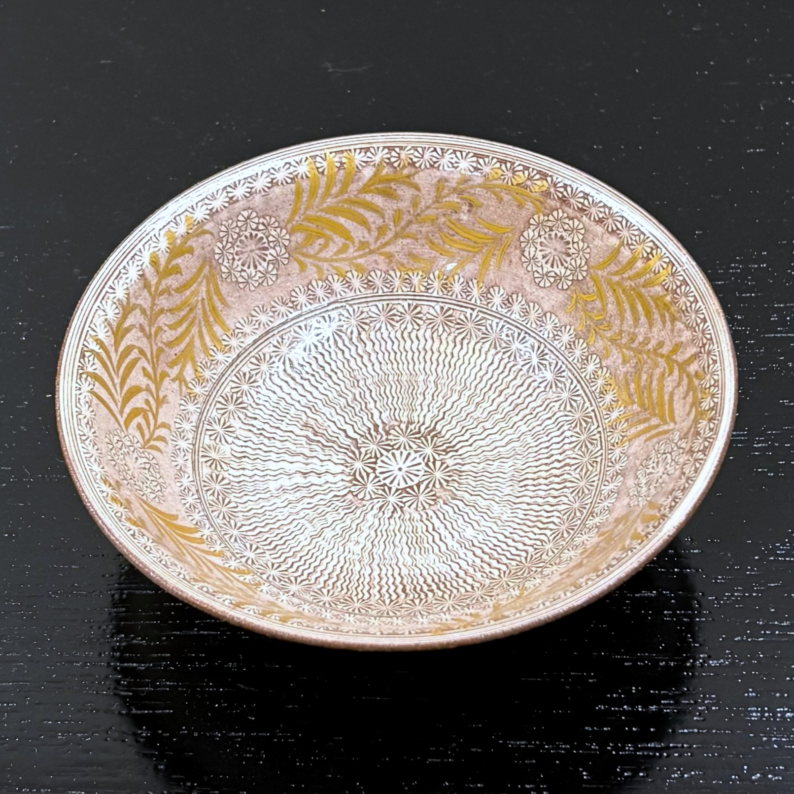細やかに花文様を押印し、白土を埋め込む印花という伝統的な技法の三島手を、