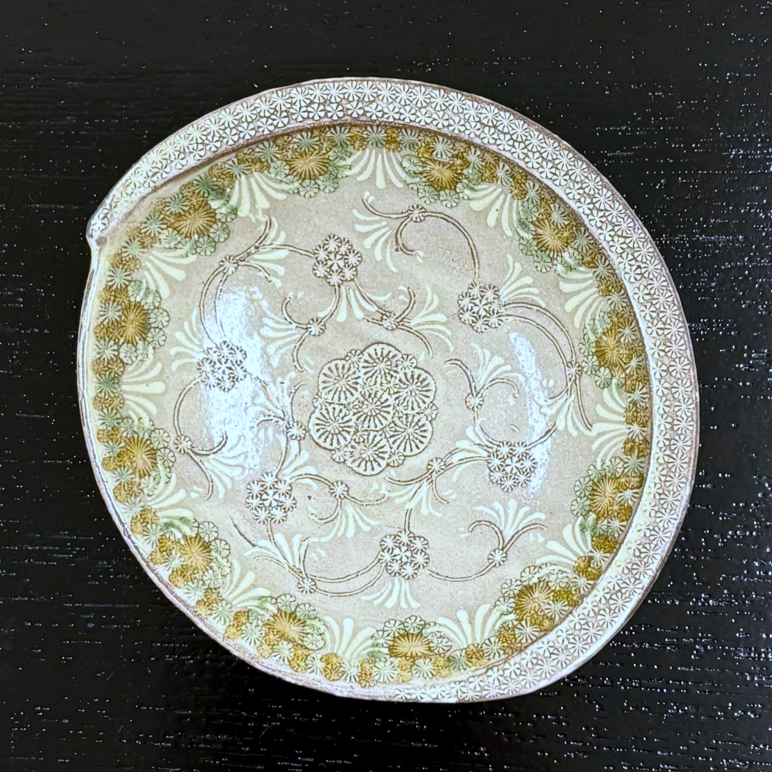細やかに花文様を押印し、白土を埋め込む印花という伝統的な技法の三島手を、