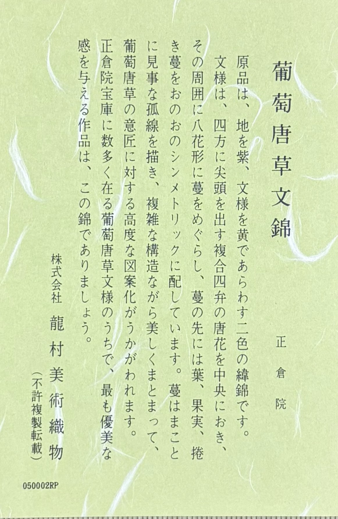 「龍村美術織物」とは、1894年(明治27年)に京都・西陣の地で、初代龍村平藏(1876年~1962年)によって創業された、美術織物制作を専門とする老舗メーカーです。初代平藏は、織りの技法に創意工夫を重ね、新たな織物の美の追求と古代の織物の研究・復元に尽力し、日本だけでなく海外にもその名が知られています。