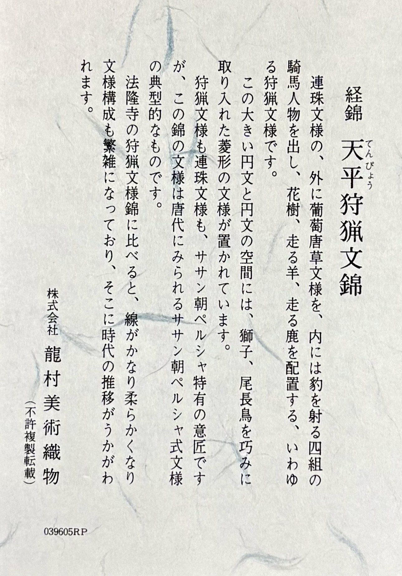 「龍村美術織物」とは、1894年(明治27年)に京都・西陣の地で、初代龍村平藏(1876年~1962年)によって創業された、美術織物制作を専門とする老舗メーカーです。初代平藏は、織りの技法に創意工夫を重ね、新たな織物の美の追求と古代の織物の研究・復元に尽力し、日本だけでなく海外にもその名が知られています。