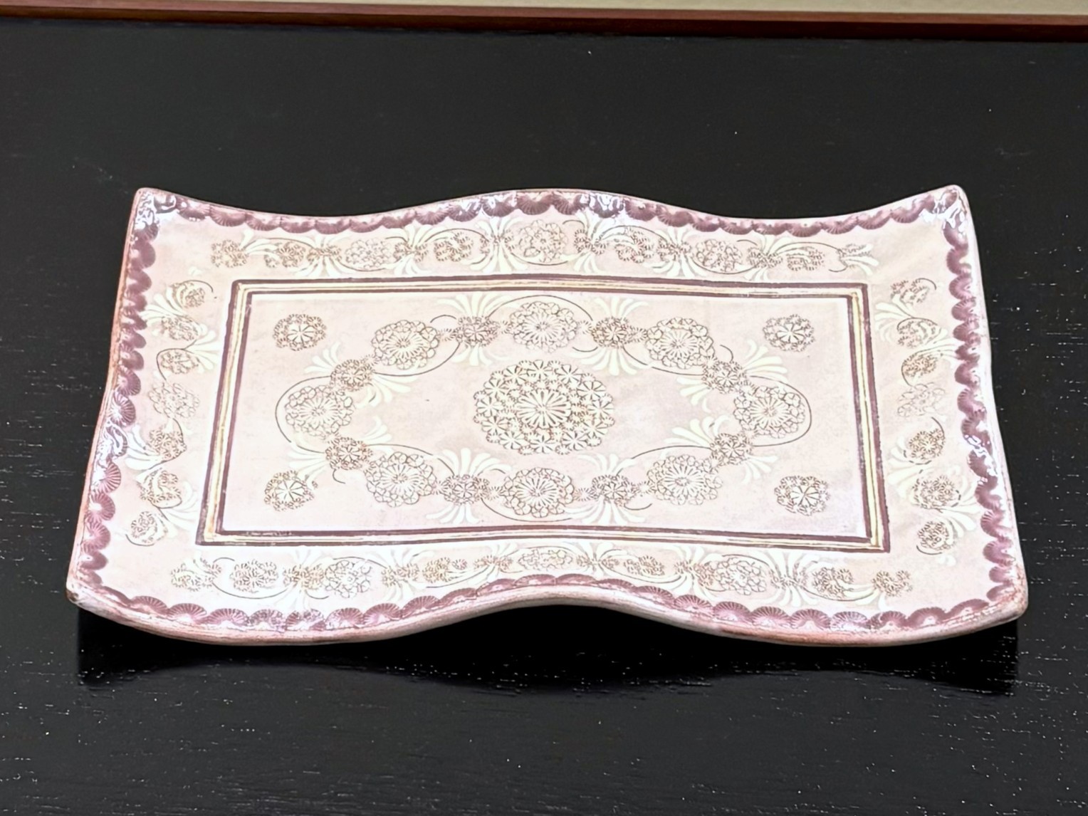 細やかに花文様を押印し、白土を埋め込む印花という伝統的な技法の三島手を、